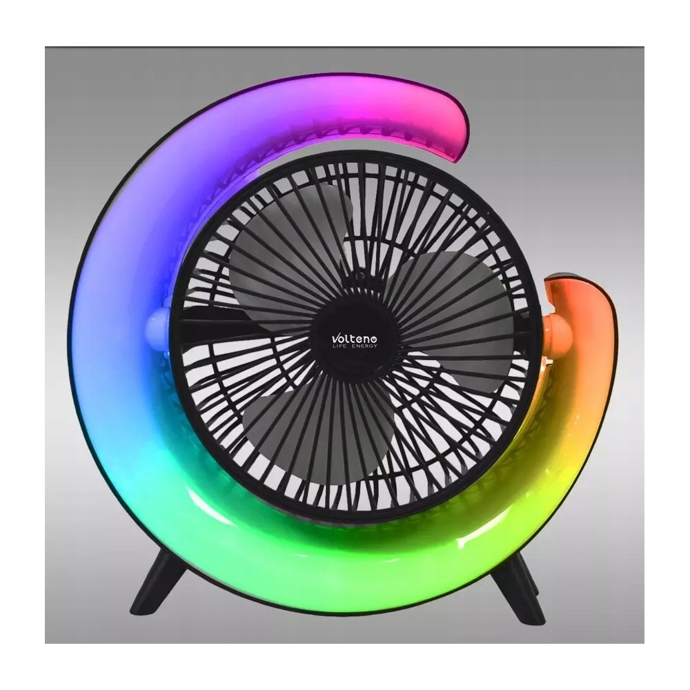 Wentylator biurkowy marki Volteno. To przenośny wentylator zasilany akumulatorowo , ładowany przez port USB w całości wykonany z tworzywa sztucznego, posiada plastikowe łopatki. Wentylator z oświetleniem RGB .